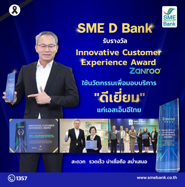 ธนาคารพัฒนาวิสาหกิจขนาดกลางและขนาดย่อมแห่งประเทศไทย (ธพว.) หรือ SME D Bank รับมอบรางวัล Innovative Customer Experience Award จาก Zanroo บริษัทชั้นนำผู้ให้บริการเทคโนโลยี Social Listening และ Data Analytics โดยจะมอบรางวัลดังกล่าวให้แก่องค์กรหรือแบรนด์ที่นำเทคโนโลยีดิจิทัลมาบริการดูแลลูกค้าได้อย่างดีเยี่ยม ทั้งความรวดเร็ว น่าเชื่อถือ สม่ำเสมอ ลดขั้นตอน ตลอดจนสร้างประสบการณ์ที่ดี และความพึงพอใจจากบริการที่ราบรื่น ซึ่งบริการของ SME D Bank มีความโดดเด่น ยึด ลูกค้าเป็นศูนย์กลาง นำนวัตกรรมมายกระดับขับเคลื่อนการให้บริการลูกค้าและผู้ประกอบการเอสเอ็มอีได้อย่างดีเยี่ยม เหมาะสมกับยุคดิจิทัล ด้วยการใช้เทคโนโลยี เช่น Social Monitoring และ Chatbot มาอำนวยความสะดวก ตอบสนองความต้องการของลูกค้าในทุกช่องทางติดต่อ ช่วยให้ลูกค้า โดยเฉพาะกลุ่มผู้ประกอบการเอสเอ็มอีเข้าถึงบริการต่าง ๆ ทั้งด้านการเงิน หรือด้านการพัฒนา ได้สะดวกสบาย รวมถึง สามารถตอบข้อสงสัยและคำถามต่างๆ ได้ครบถ้วน ตลอด 24 ชม.