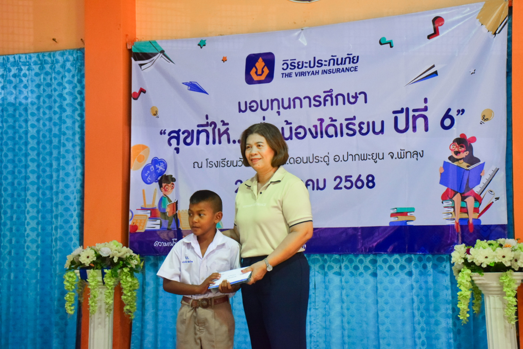 นางเสาวคนธ์ วงศ์กองแสง ผู้จัดการฝ่ายปฏิบัติการภาค 5 (ภาคใต้) ด้านสาขา บริษัท วิริยะประกันภัย จำกัด (มหาชน) เป็นผู้แทนมอบทุนการศึกษา จำนวน 200 ทุน เป็นเงิน 214,900 บาท ภายใต้โครงการ สุขที่ให้...เพื่อน้องได้เรียน ปีที่ 6 เพื่อส่งเสริมโอกาสทางการศึกษาให้กับนักเรียนที่มีผลการเรียนดีแต่ขาดแคลนทุนทรัพย์ ทั้งนี้ บริษัทฯ ได้เริ่มต้นจัดพิธีมอบทุนการศึกษา จำนวน 60 ทุน เป็นเงิน 60,000 บาท พร้อมนำกลุ่มวิริยะจิตอาสา สาขาหาดใหญ่ จัดเลี้ยงอาหารกลางวัน พร้อมมอบอุปกรณ์การเรียนแก่เด็กนักเรียนในพื้นที่จังหวัดพัทลุงทั้งหมด 12 โรงเรียน โดยมี นายภัค ฤทธิเดช ผู้อำนวยการโรงเรียนวัดหัวควน เป็นผู้แทนรับมอบ ณ โรงเรียนวัดหัวควน ต.ประดู่ อ.ปากพะยูน จ.พัทลุง