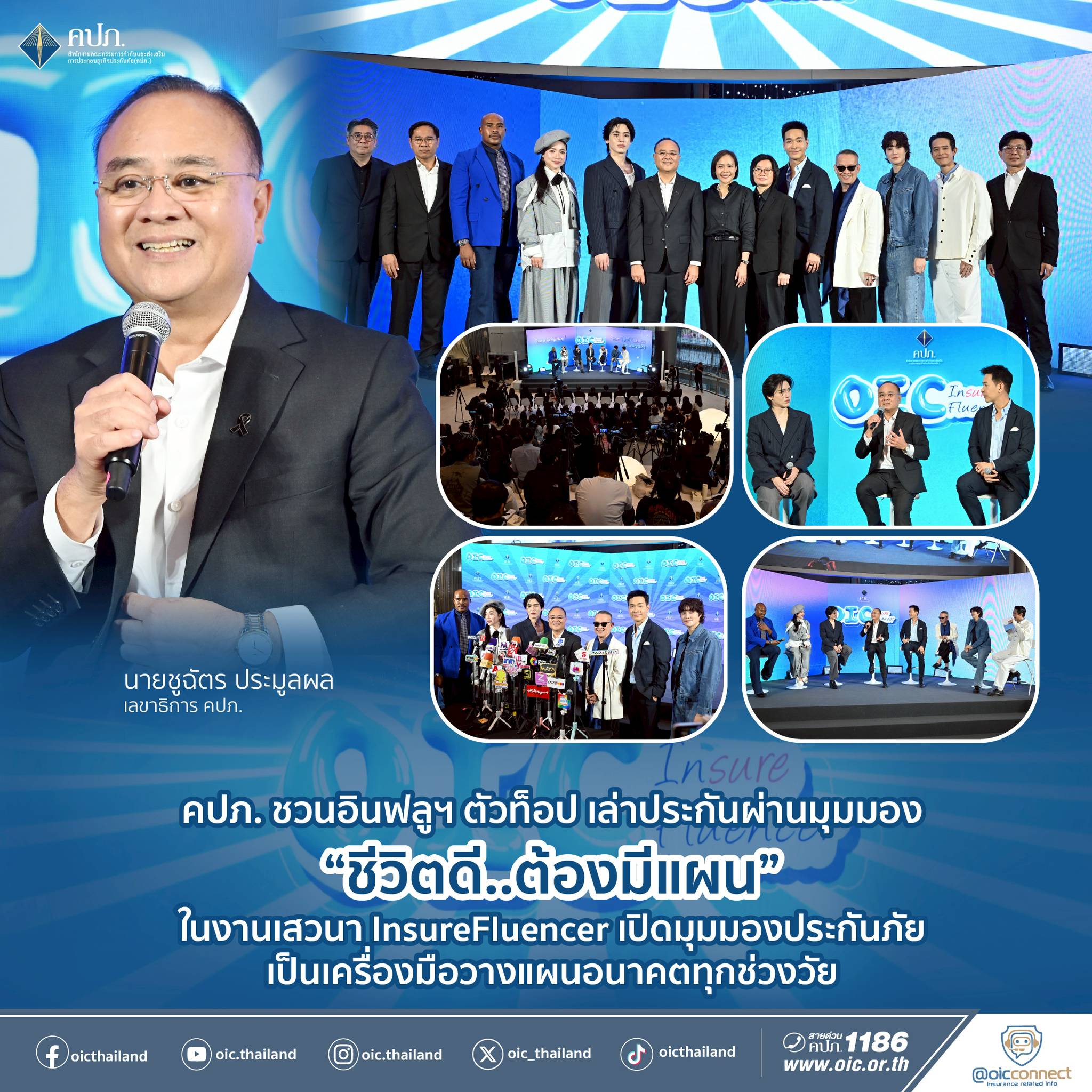 นายชูฉัตร ประมูลผล เลขาธิการ คปภ. ร่วมพูดคุยกับ Influencer ทั้ง 6 ท่าน ถ่ายทอดแนวคิดและประสบการณ์ด้านการวางแผนชีวิตในหลากหลายมิติที่เกี่ยวข้องกับประกันภัยอย่างรอบด้าน ได้แก่ ป้าตือสมบัษร ถิระสาโรช ถ่ายทอดแนวทางการวางแผนชีวิตวัยเกษียณ และสิทธิประกันภัยที่ผู้สูงอายุต้องรู้ ตลอดจนการใช้ประกันชีวิตและประกันโรคร้ายแรงเป็นเครื่องมือสร้างความมั่นคง หมอเจี๊ยบลลนา ก้องธรนินทร์ ให้ความรู้ด้านสุขภาพ โดยเฉพาะโรคมะเร็งซึ่งเป็นโรคร้ายแรงอันดับหนึ่งพร้อมประสบการณ์ส่วนตัวเกี่ยวกับสุขภาพ การวางแผนประกันสุขภาพ ประกันทรัพย์สิน ประกันอัคคีภัย และประกันภัยสัตว์เลี้ยง คุณต้นหอมศกุนตลา เทียนไพโรจน์ และ คุณรัศมีแข ฟ้าเกื้อล้น ร่วมแลกเปลี่ยนประสบการณ์การใช้ประกันภัยอุบัติเหตุสำหรับผู้ที่มีไลฟ์สไตล์ลุยกิจกรรม รวมถึงการวางแผนประกันภัยสำหรับเด็กและการส่งต่อมรดกเพื่อดูแลครอบครัวในอนาคต คุณพอลภัทรพล ศิลปาจารย์ นำเสนอแนวคิดการวางแผนทางการเงินร่วมกับประกันภัย เช่น ประกันชีวิตบำนาญ และประกันชีวิตควบการลงทุน เพื่อสร้างความมั่นคงในระยะยาว คุณนิวฐิติภูมิ เตชะอภัยคุณ ถ่ายทอดแนวคิดประกันภัยยุคดิจิทัล การประกันภัยไซเบอร์ และการประกันภัยรถยนต์ไฟฟ้า ดำเนินรายการเสวนา โดย คุณโบ ธนากร ชินกูล ซึ่งมีบทบาทสำคัญในการเชื่อมโยงประเด็นด้านประกันภัยให้เข้าใจง่ายและเข้าถึงผู้ฟังทุกช่วงวัย โดยช่วงท้ายของการเสวนา เลขาธิการ คปภ. ได้สรุปประเด็นสำคัญจากทุกมุมมองที่ Influencer ทั้ง 6 ท่านได้ร่วมถ่ายทอด พร้อมเน้นย้ำว่า การวางแผนชีวิตโดยใช้ประกันภัยให้ถูกต้อง เหมาะสม และทันยุคสมัย คือกุญแจสำคัญในการสร้างความมั่นคงให้ประชาชนในทุกช่วงวัย