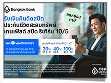 กรุงเทพประกันชีวิต จับมือ ธนาคารกรุงเทพ ลอนช์ผลิตภัณฑ์ใหม่ ประกันชีวิตสะสมทรัพย์ เกนเฟิสต์ สปีด รีเทิร์น 10/5 ตอบโจทย์ความต้องการของคนรุ่นใหม่ที่มองหาทางเลือกในการวางแผนการเงินควบคู่การลดหย่อนภาษีช่วงปลายปี ชูจุดเด่น จ่ายเบี้ยสั้นเพียง 5 ปี คุ้มครอง 10 ปี รับเงินคืนมีเงินคืนตั้งแต่ปีที่ 2 - 9 และเงินครบกำหนดสัญญา สมัครง่ายผ่านโมบายแบงก์กิ้งธนาคารกรุงเทพ