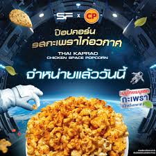 ศุภรา ศรีบูรณ์ รองกรรมการผู้จัดการ ธุรกิจการค้าในประเทศ CPF (B2B Food Service) บริษัท เจริญโภคภัณฑ์อาหาร จำกัด (มหาชน) กล่าวว่า ซีพีเอฟมีความยินดีเป็นอย่างยิ่งที่ได้ร่วมมือกับ เอส เอฟ อีกครั้ง เพื่อต่อยอดความสำเร็จของผลิตภัณฑ์ซีพีสู่ประสบการณ์ใหม่ในรูปแบบป๊อปคอร์นรสชาติพิเศษ ป๊อปคอร์นรสกะเพราไก่อวกาศ ได้รับแรงบันดาลใจจากเมนูอกไก่กะเพรา ซึ่งผ่านการรับรองมาตรฐาน ความปลอดภัยด้านอาหาร ในระดับสูงสุดตามมาตรฐานอาหารอวกาศ