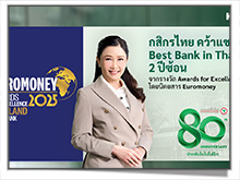 ยูโรมันนี่ (Euromoney) นิตยสารด้านการเงินชั้นนำระดับโลกได้เปิดเผยผลการพิจารณารางวัลในโครงการ Euromoney Awards for Excellence 2025 ซึ่งจัดขึ้นต่อเนื่องกว่า 30 ปี เพื่อยกย่องธนาคารและบุคลากรในแวดวงการเงินที่มีความโดดเด่น โดยปัจจุบันถือเป็นหนึ่งในรางวัลสำคัญที่สุดของอุตสาหกรรมการเงินระดับโลก ที่ได้รับความเชื่อถืออย่างสูง โดยในปี 2568 นี้ มีธนาคารกว่า 600 แห่ง จากราว 100 ประเทศทั่วโลก ส่งข้อมูลเข้าร่วมรับการพิจารณารางวัล สำหรับประเทศไทย ยูโรมันนี่ได้ประกาศให้ธนาคารกสิกรไทยได้รับรางวัลธนาคารที่ดีที่สุดของไทย (Thailands Best Bank) ประจำปี 2568 เป็นปีที่ 2 ติดต่อกัน จากความสำเร็จในการดำเนินยุทธศาสตร์ 3+1 และ Productivity Strategy ที่ส่งผลให้ธนาคารมีผลการดำเนินงานทางการเงินที่แข็งแกร่ง และความเป็นผู้นำด้านนวัตกรรมดิจิทัลสำหรับลูกค้ารายย่อย สามารถขับเคลื่อนธุรกิจอย่างมั่นคงท่ามกลางความไม่แน่นอนและความท้าทายทางเศรษฐกิจของไทย