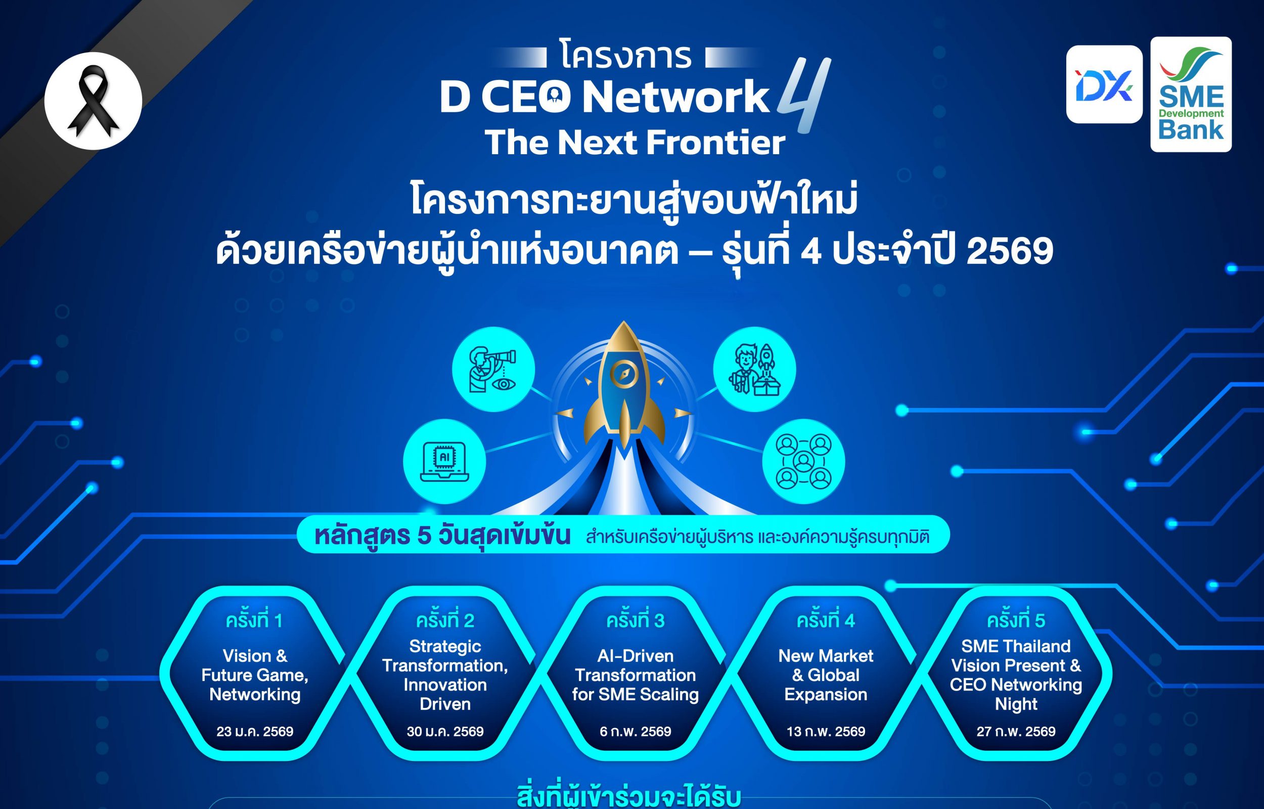 ธนาคารพัฒนาวิสาหกิจขนาดกลางและขนาดย่อมแห่งประเทศไทย (ธพว.) หรือ SME D Bank เดินหน้าภารกิจด้านการพัฒนา ส่งเสริมและสนับสนุนผู้ประกอบการเอสเอ็มอีไทยให้เติบโตอย่างยั่งยืน จัดโครงการ D CEO Network รุ่นที่ 4 สิทธิพิเศษสำหรับลูกค้าของ SME D Bank เท่านั้น ทั้งที่เป็นผู้บริหาร เจ้าของกิจการ หรือทายาทธุรกิจ เชิญชวนเข้าร่วมรับการอบรม แลกเปลี่ยนเรียนรู้ ด้วยหลักสูตรเข้มข้น ช่วยเสริมแกร่งก้าวข้ามความท้าทายในยุคดิจิทัล อีกทั้ง เดินหน้าสู่ธุรกิจสีเขียว พร้อมตามทันเทรนด์เทคโนโลยีAI การเงินเชิงกลยุทธ์ และโอกาสเจาะตลาดใหม่ทั่วโลก จัดจำนวน 5 ครั้ง ใน 5 หลักสูตรเข้มข้น ทุกวันศุกร์ เริ่มตั้งแต่วันศุกร์ที่ 23 มกราคม 2569 ถึงวันศุกร์ที่ 27 กุมภาพันธ์ 2569 ณ ห้องกัญญลักษณ์ ชั้น 3 โรงแรมโฟร์วิงส์ สุขุมวิท 26